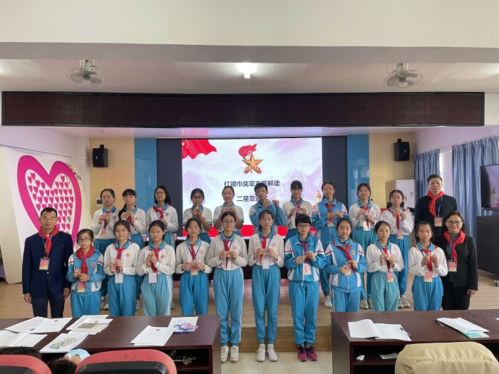 下午3:45,主持人宣布大會開始。會議在嘹亮的國歌聲中拉開序幕。接著,出大隊旗,少先隊員齊唱隊歌,氣勢高昂。少先隊副輔導員李園靜老師解讀紅領巾獎章方案,梁銓華校長為獲得鎮(zhèn)二星章的同學頒發(fā)獎章;第三屆大隊長作少先隊工作報告。隨后,主持人先后宣讀中國少年先鋒隊中山市港口鎮(zhèn)群眾小學第二屆少工委候選人名單、第四屆大隊委候選人名單,并獲得了全票通過。鎮(zhèn)團委副書記宋國飛同志和鎮(zhèn)總輔導員曾凡苑老師為學校第二屆少工委主任梁銓華、少工委副主席廖潔瑩、郭南洪、彭峰頒發(fā)聘書,少工委主任梁銓華為第二屆少工委委員頒發(fā)聘書,并合影留念。