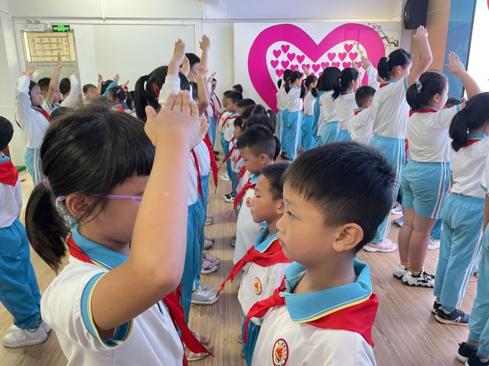 入隊(duì)儀式在鮮艷的隊(duì)旗下、嘹亮的歌聲中拉開帷幕。首先,大隊(duì)委李青璇同學(xué)宣讀入隊(duì)名單,高年級的哥哥姐姐們?yōu)樾玛?duì)員佩戴紅領(lǐng)巾。大隊(duì)輔導(dǎo)員胡嬋媛老師帶領(lǐng)少先隊(duì)員在隊(duì)旗下莊嚴(yán)宣誓。接著,二(1)中隊(duì)周芷瑄代表全體新隊(duì)員發(fā)言,立壯志、表決心。六(1)中隊(duì)鄺涵睿代表老隊(duì)員發(fā)言,希望新隊(duì)員努力成為一個(gè)自尊、自愛、自強(qiáng)、自律的優(yōu)秀少先隊(duì)員。少工委郭南洪副主任對新老隊(duì)員寄予了厚望,希望隊(duì)員們好好學(xué)習(xí),好好鍛煉,在星星火炬的指引下茁壯成長!最后,大隊(duì)輔導(dǎo)員胡嬋媛老師帶領(lǐng)全體少先隊(duì)員呼號,“準(zhǔn)備著:為共產(chǎn)主義事業(yè)而奮斗”——“時(shí)刻準(zhǔn)備著!”入隊(duì)儀式在隊(duì)員們稚嫩鏗鏘的呼號聲圓滿結(jié)束。
