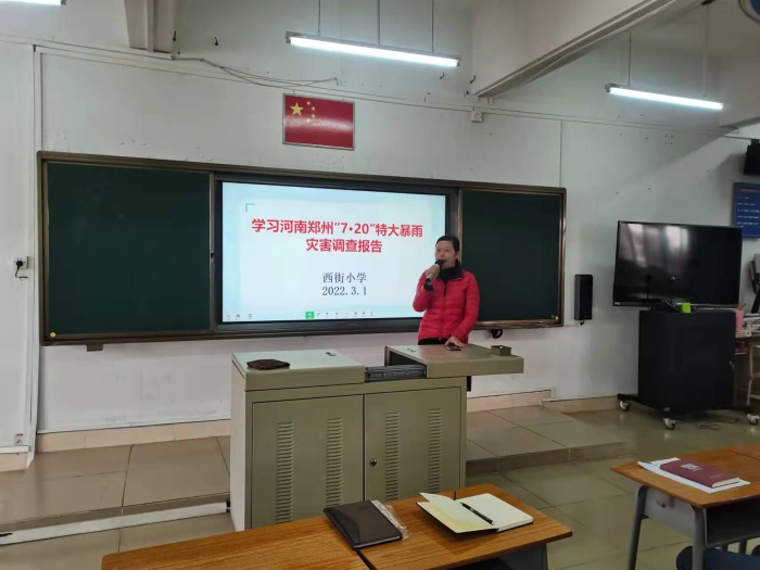 2022年3月1日,西街小學召開全體教師會議傳達、學習河南鄭州“7·20”特大暴雨災害調(diào)查報告。負責學校安全工作的梁麗鴻校長分別從災害情況及主要特點、災害應急處置、相關地方黨委政府及其部門單位責任問題、主要教訓以及改進措施建議5個方面進行深刻剖析解讀。
