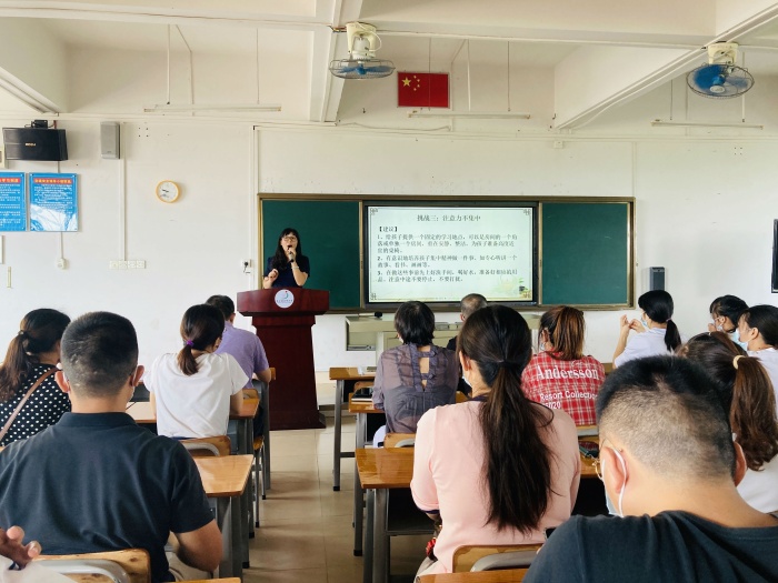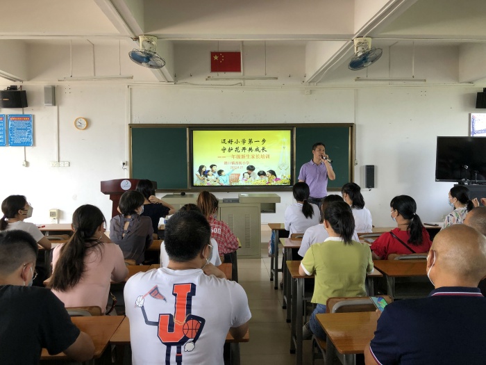 梁雪芳副主任為家長(zhǎng)們作開(kāi)學(xué)前的指引性講座,一年級(jí)全體家長(zhǎng)參與家長(zhǎng)培訓(xùn)會(huì)議。為幫助孩子和家長(zhǎng)消除初入小學(xué)的緊張和焦慮,盡快適應(yīng)小學(xué)的學(xué)習(xí)和生活,梁副主任從幼兒升小學(xué)必須過(guò)好的五關(guān):心理關(guān)、學(xué)習(xí)關(guān)、生活關(guān)、物質(zhì)關(guān)、交際關(guān),向家長(zhǎng)們?nèi)娴亟榻B了一年級(jí)新生開(kāi)學(xué)前的準(zhǔn)備工作、學(xué)生一日常規(guī)指引、學(xué)生良好行為習(xí)慣和學(xué)習(xí)習(xí)慣培養(yǎng)指引、學(xué)生安全意識(shí)培養(yǎng)指引等其他方面,并對(duì)校園防疫工作和學(xué)生衛(wèi)生防疫要求進(jìn)行了細(xì)致清晰的講解。隨后,梁容根校長(zhǎng)作總結(jié)發(fā)言,給家長(zhǎng)們指明了家庭教育的方向。
