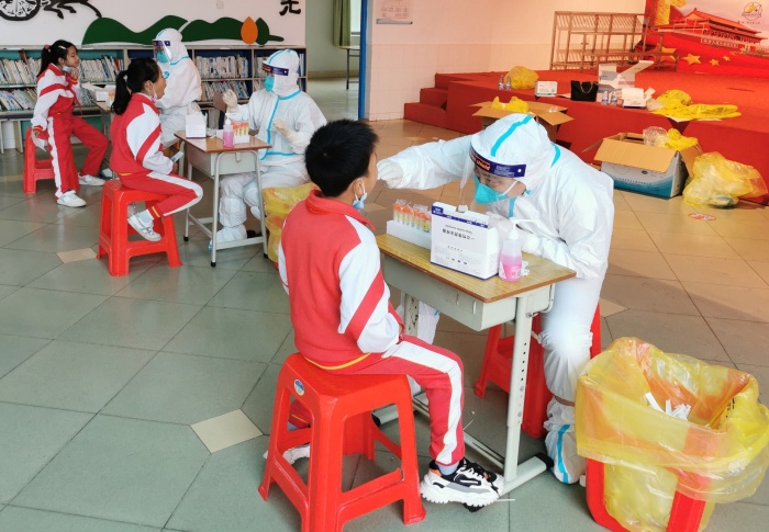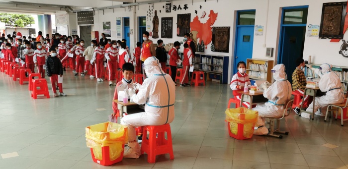 在檢測(cè)現(xiàn)場(chǎng),德育處主任梁倚靜用校園廣播進(jìn)行通知,指導(dǎo)學(xué)生按照10人一組的名單順序進(jìn)行排隊(duì),采樣中學(xué)生們有序地站成一排安靜地等待,老師們協(xié)助檢測(cè)人員對(duì)檢測(cè)名單進(jìn)行核對(duì),不漏一人,不錯(cuò)一人。