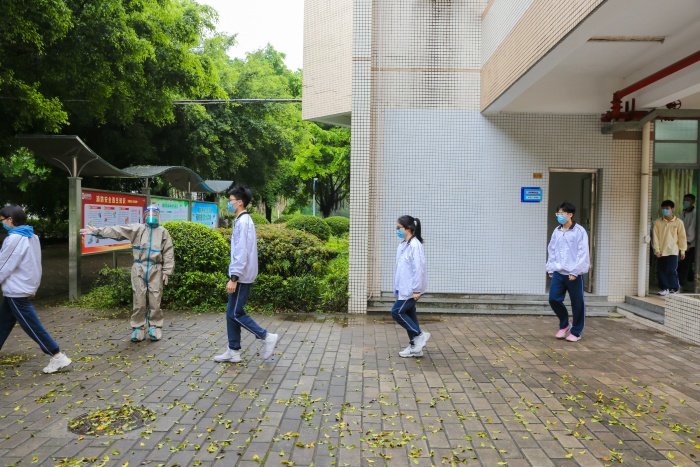 隨后醫(yī)療保障組工作人員穿上防護(hù)服佩戴好醫(yī)用外科口罩到班級(jí),校醫(yī)到達(dá)班級(jí)門(mén)口,為密接學(xué)生佩戴好醫(yī)用外科口罩,帶領(lǐng)該學(xué)生到空曠地區(qū)等待疾控轉(zhuǎn)運(yùn)車(chē)的到來(lái)。該校及時(shí)提供全校師生,工勤人員,來(lái)訪人員等相關(guān)人員名單資料給疾控現(xiàn)場(chǎng)流調(diào)人員判定次密接:密切接觸者所涉班級(jí)暫停線下教學(xué)3天,改為線上教學(xué),按“三天兩檢”完成兩次核酸檢測(cè),全員陰性后即可復(fù)課。次密接按規(guī)范轉(zhuǎn)運(yùn)酒店集中隔離,其余師生員工加強(qiáng)健康監(jiān)測(cè)。