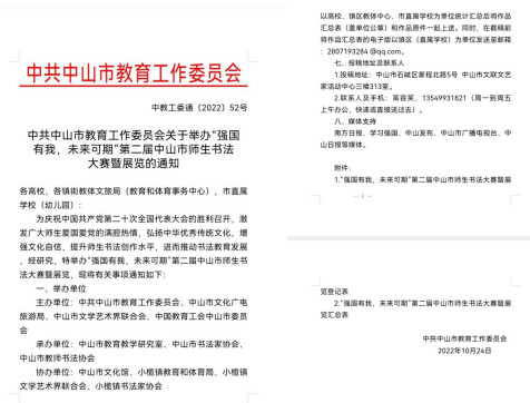 為慶祝中國(guó)共產(chǎn)黨第二十次全國(guó)代表大會(huì)的勝利召開(kāi),激發(fā)廣大師生愛(ài)國(guó)愛(ài)黨的滿腔熱情,弘揚(yáng)中華優(yōu)秀傳統(tǒng)文化,增強(qiáng)文化自信,提升師生書(shū)法創(chuàng)作水平,進(jìn)而推動(dòng)書(shū)法教育發(fā)展,由中共中山市教育工作委員會(huì)舉辦“強(qiáng)國(guó)有我,未來(lái)可期”第二屆中山市師生書(shū)法大賽,我校師生積極組織參加。