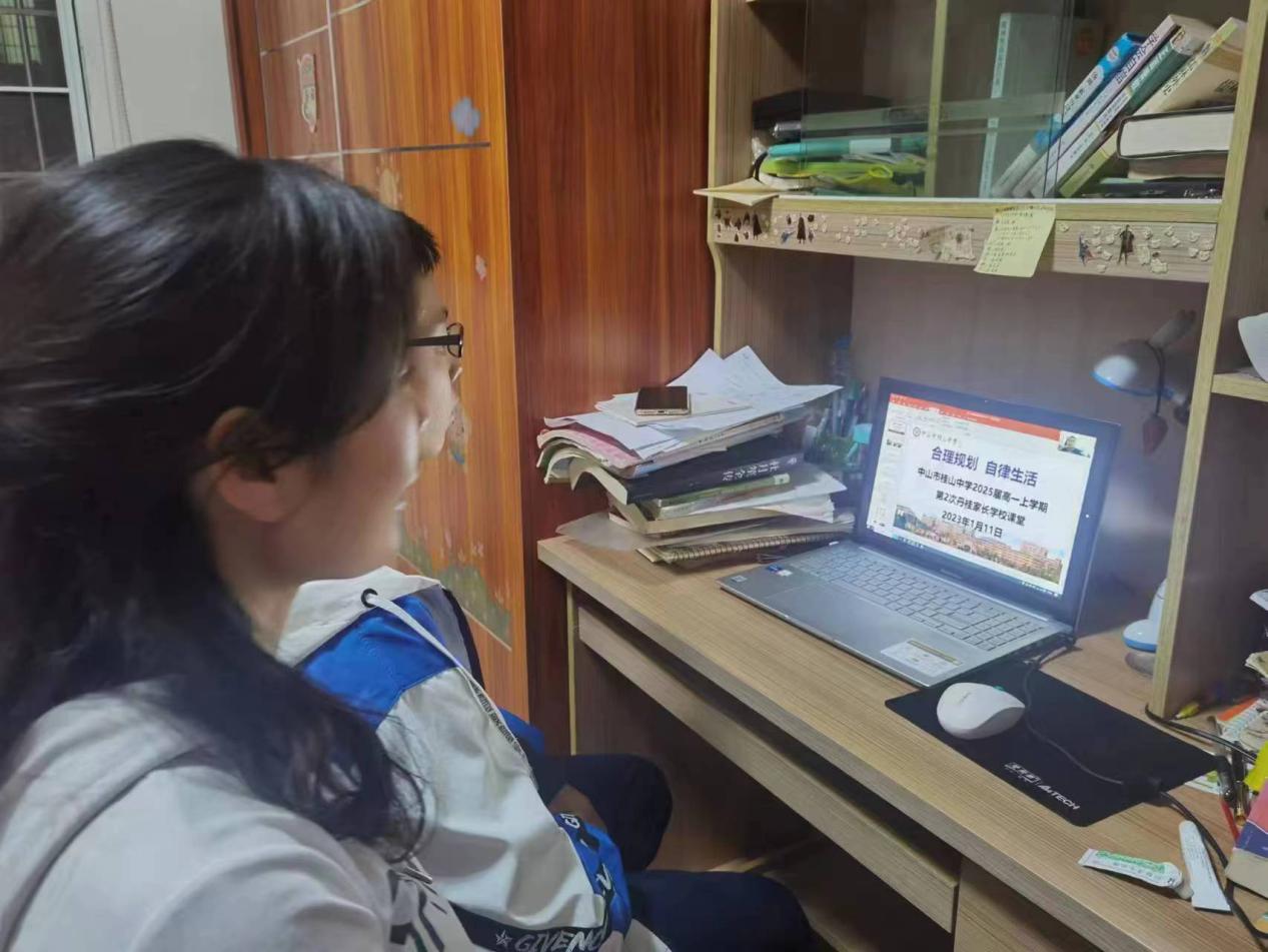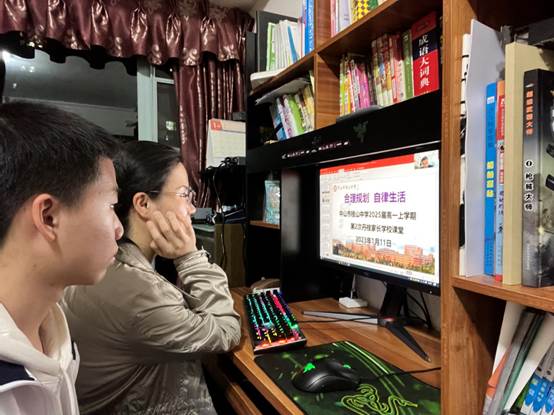 丁主任首先以照片和視頻等形式分享了本學(xué)期同學(xué)在校生活的點(diǎn)點(diǎn)滴滴,一張張照片勾起了同學(xué)們?cè)诠鹕降某砷L(zhǎng)初記憶。與班主任的初次見(jiàn)面會(huì)、入學(xué)教育講座、刻骨銘心的軍訓(xùn)、我愛(ài)我班團(tuán)康活動(dòng)、疊被子大賽、模擬法庭、社團(tuán)招新、運(yùn)動(dòng)會(huì)和段考,一次次精彩活動(dòng)照片切實(shí)讓家長(zhǎng)感受到孩子在桂山的適應(yīng)、成長(zhǎng)與變化。丹桂家長(zhǎng)學(xué)校課堂部分,丁主任從構(gòu)建積極和諧親子關(guān)系、合理規(guī)劃和應(yīng)對(duì)統(tǒng)考、以德育作業(yè)陪伴成長(zhǎng)、認(rèn)識(shí)自我與理性選科、寒假安全等方面向家長(zhǎng)和同學(xué)強(qiáng)調(diào)了寒假期間要注意的事項(xiàng)