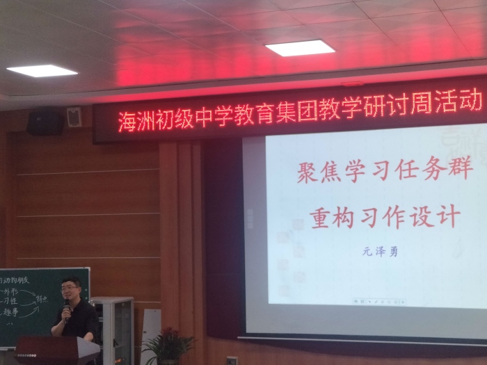 緊接著,鎮(zhèn)語文教研組長元澤勇主任帶來題為“聚焦學(xué)習(xí)任務(wù)群、重構(gòu)習(xí)作設(shè)計(jì)”的講座。元老師從課例評(píng)價(jià)出發(fā),對(duì)于在作文教學(xué)中如何設(shè)計(jì)任務(wù)群,如何引導(dǎo)學(xué)生言語實(shí)踐,作了一場精彩的講座。
