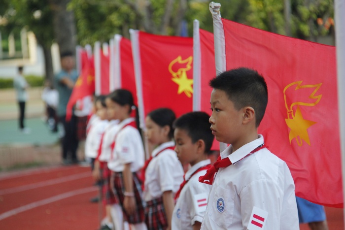 活動(dòng)最后,學(xué)校少工委大隊(duì)輔導(dǎo)員劉姝鶯老師帶領(lǐng)全體隊(duì)員呼號?!皽?zhǔn)備著,為共產(chǎn)主義事業(yè)貢獻(xiàn)力量!”“時(shí)刻準(zhǔn)備著!”他們的聲音響徹校園,他們的神情莊嚴(yán)而又堅(jiān)毅!