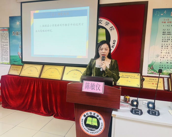 首先由課題主持人進行結(jié)題匯報。本次參與結(jié)題鑒定的共有四個課題:陳敏儀老師主持的《微課在小學(xué)英語寫作教學(xué)中的運用研究》、黃麗娜老師主持的《小學(xué)英語語音教學(xué)繪本的整合與應(yīng)用研究》、李煜霞副主任主持的《在繪畫活動中培育小學(xué)低年級學(xué)生創(chuàng)造力的實踐研究》、汪芳副校長主持的《小學(xué)高年級群文閱讀課內(nèi)外閱讀相結(jié)合的實踐研究》。四位課題主持人代表課題組依次做了結(jié)題匯報。她們圍繞課題背景、研究內(nèi)容、研究目標、研究方法、研究成果和研究創(chuàng)新等方面進行了詳細的闡述和匯報。專家們傾心聆聽,對課題開展情況有了更全面細致的了解。