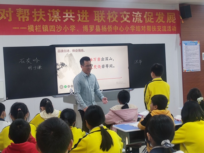 次日,橫欄四沙小學(xué)組織梁洪華、黃麗芬、司徒嘉穎三位語(yǔ)數(shù)英名師(骨干)代表在楊僑中心小學(xué)開(kāi)展名師送教活動(dòng)?;顒?dòng)中,三位老師分別展示三節(jié)精彩紛呈的示范課——梁洪華老師執(zhí)教《石灰吟》,黃麗芬老師執(zhí)教《比例的意義》,司徒嘉穎老師執(zhí)教《Unit5 Do you like pears?(PartB Let’s learn)》。梁老師的課注重教學(xué)目標(biāo)的落實(shí),體現(xiàn)了以生為本、以學(xué)定教,能結(jié)合學(xué)情和生活實(shí)際合理安排教學(xué)活動(dòng);黃老師的課堂氣氛活躍,學(xué)生積極思考,語(yǔ)言表達(dá)流暢、生動(dòng);司徒嘉穎老師的課關(guān)注學(xué)生發(fā)展,借助信息技術(shù)充分調(diào)動(dòng)了學(xué)生積極性,有效培養(yǎng)學(xué)生動(dòng)手實(shí)踐能力和合作學(xué)習(xí)能力。他們的課堂教學(xué)環(huán)節(jié)緊湊、張弛有度,教師的教學(xué)基本功扎實(shí),對(duì)教材理解透徹,對(duì)重難點(diǎn)把握精準(zhǔn)。課后,楊僑中心小學(xué)的老師們對(duì)梁洪華、黃麗芬、司徒嘉穎三位老師的課堂給予了高度評(píng)價(jià),并與兩校老師展開(kāi)了熱烈的研討交流。