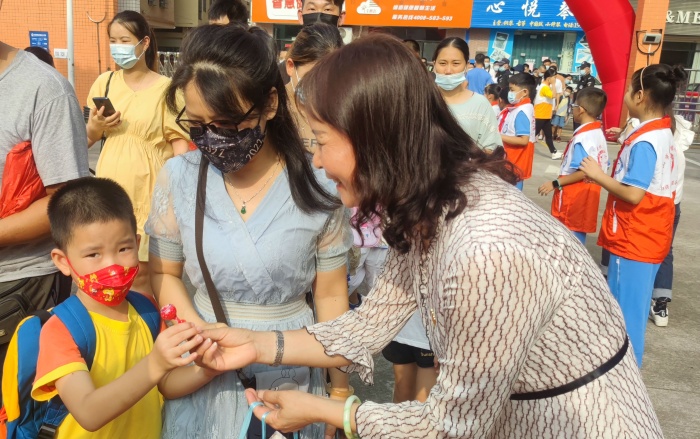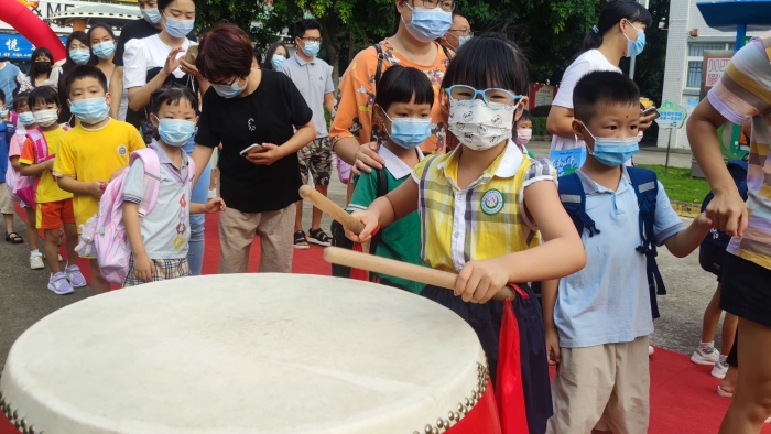 早上八點(diǎn)三十分,一年級(jí)新生和家長(zhǎng)攜手進(jìn)入校門(mén)。學(xué)校行政老師和學(xué)生、家長(zhǎng)志愿者們列隊(duì)站在校道上禮貌地和每一個(gè)新同學(xué)打招呼,還為新生送上入校禮物——一根寓意著濃濃情意、滿(mǎn)滿(mǎn)鼓勵(lì)的棒棒糖。孩子們收到禮物,笑逐顏開(kāi),一下子就消除了緊張的心情。新生邁步走過(guò)紅地毯,先后完成學(xué)校精心布置的“朱砂點(diǎn)痣”“擊鼓明志”“新生打卡拍照點(diǎn)”三個(gè)環(huán)節(jié)進(jìn)入課室,全程儀式感滿(mǎn)滿(mǎn)。