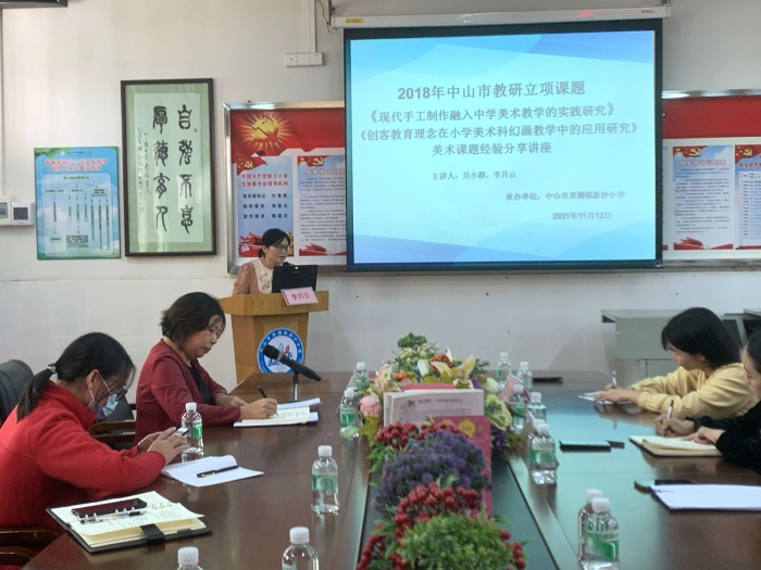 為進(jìn)一步提升美術(shù)教師科研水平和教學(xué)能力,加強(qiáng)科研和教學(xué)經(jīng)驗(yàn)交流、促進(jìn)教育教學(xué)水平的提高,總結(jié)推廣新沙小學(xué)2018中山市教育科研立項(xiàng)課題《創(chuàng)客教育理念在小學(xué)美術(shù)科幻畫中的應(yīng)用研究》研究經(jīng)驗(yàn)與成果,引領(lǐng)課題研究活動(dòng)科學(xué)、規(guī)范開(kāi)展。2021年11月12日下午,黃圃鎮(zhèn)美術(shù)教研活動(dòng)“美術(shù)課題經(jīng)驗(yàn)分享講座”在新沙小學(xué)舉行,課題主持人李月云老師作為主講人。黃圃鎮(zhèn)教育和體育事務(wù)中心藝術(shù)專干杜晗婷老師以及黃圃鎮(zhèn)中小學(xué)美術(shù)教師參加本次活動(dòng)。