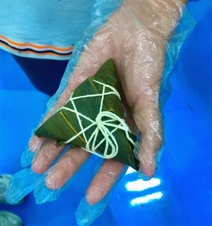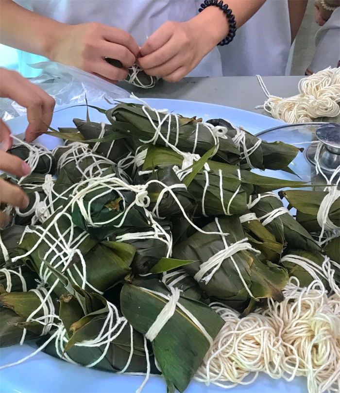 同學(xué)們在老師的指導(dǎo)下,認真學(xué)習(xí)包粽子。經(jīng)過兩個多小時的忙碌,大大小小的鮮肉粽子堆成了小山,濃濃的粽香飄溢在校園里。一片片清香的粽葉、一粒粒晶瑩的糯米,在一雙雙巧手下,瞬間變成了一個個形態(tài)各異的粽子。老師和同學(xué)們分享著這些美味可口的勞動果實,整個活動現(xiàn)場其樂融融。