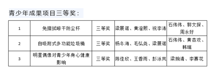 本次大賽由市科協(xié)、市教體局、市科技局、團(tuán)市委、市文明辦聯(lián)合主辦,根據(jù)大賽競賽規(guī)則,經(jīng)評(píng)審委員會(huì)評(píng)審,共評(píng)出獲獎(jiǎng)項(xiàng)目397項(xiàng)。其中,科技創(chuàng)新成果項(xiàng)目一等獎(jiǎng)63項(xiàng)、二等獎(jiǎng)86項(xiàng)、三等獎(jiǎng)154項(xiàng);優(yōu)秀輔導(dǎo)員科技創(chuàng)新成果項(xiàng)目一等獎(jiǎng)15項(xiàng)、二等獎(jiǎng)22項(xiàng)、三等獎(jiǎng)37項(xiàng);十佳優(yōu)秀科技教師10名;優(yōu)秀組織獎(jiǎng)10項(xiàng)。