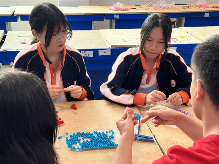 手工串珠的熱潮并沒(méi)有就此停止,各班代表回到班級(jí),在班級(jí)里進(jìn)行演示教學(xué),同學(xué)們躍躍欲試,紛紛開(kāi)始照著教程認(rèn)真編了起來(lái)。大家用一根長(zhǎng)魚(yú)線靈活地穿梭于五顏六色的珠子中,遇到不懂的地方,大家就一起探討,相互學(xué)習(xí),現(xiàn)場(chǎng)歡笑聲一片。