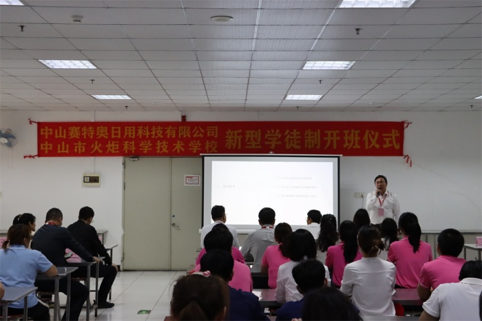 2023年3月15日,中山市火炬科學(xué)技術(shù)學(xué)校與中山賽特奧日用科技有限公司新型學(xué)徒制開班儀式在賽特奧公司舉行?;鹁婵萍紝W(xué)校校長陳建國、副校長王劍勤、校企合作處副主任鄧明、中山市人力資源和社會保障局小欖分局朱嘉敏副局長、賽特奧公司董事顏發(fā)廣、高級經(jīng)理鄒秋娟,以及相關(guān)老師、公司員工參加開班儀式。開班儀式由賽特奧公司人力資源部林創(chuàng)英主持。