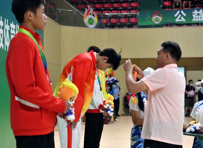 14日的冠軍爭奪戰(zhàn)出現(xiàn)了“小插曲”,嚴日豪在確立3:0比分優(yōu)勢的情況下,對手選擇了放手一搏,對嚴日豪發(fā)起了迅猛的反撲,并且在最后2秒險些翻盤得手。但嚴日豪還是憑借豐富的比賽經(jīng)驗、穩(wěn)定的心理素質(zhì)和精湛的技戰(zhàn)術(shù),成功化解了對手的攻勢,最終以5:4的比分有驚無險地贏下了比賽。“這場比賽讓人驚出冷汗,但好在他能頂住壓力拿下了比賽”,張桂斌教練點評了嚴日豪的場上表現(xiàn)。賽后,中山市教體局陳威副局長親切地為冠軍嚴日豪頒發(fā)了金牌,并直言這是一場“精彩的比賽”!