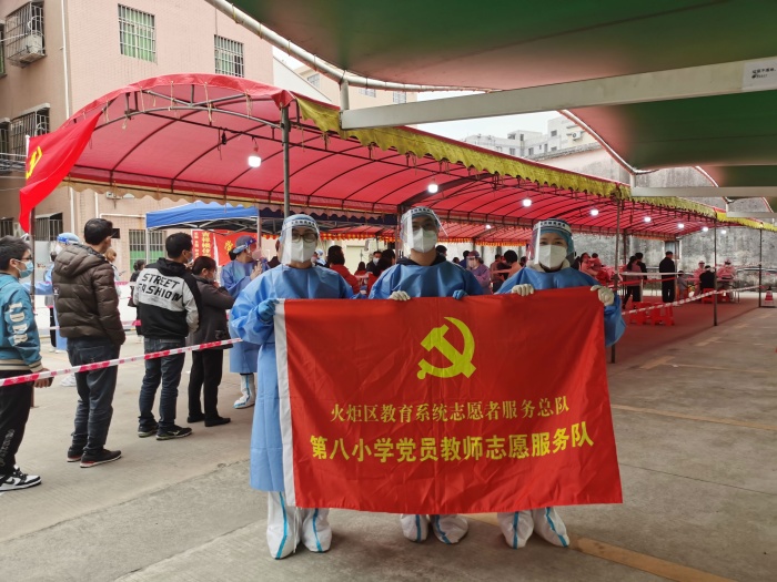 剛剛過去的2022年春節(jié)寒假,注定是不平凡的一個(gè)假期。學(xué)校接到了上級(jí)部門的緊急通知,要求派出教師志愿者到各個(gè)核算監(jiān)測(cè)點(diǎn)進(jìn)行行動(dòng)支援。接到任務(wù)后,學(xué)校迅速行動(dòng)起來,發(fā)動(dòng)全校黨員和教師進(jìn)行報(bào)名活動(dòng)。此次活動(dòng)獲得了老師們的大力支持,他們紛紛表示:防范疫情,人人有責(zé),哪里需要我,我就到哪里去!1月17日上午,黨支部書記唐從彥校長帶領(lǐng)全體行政和部分教師共7人來到了檢測(cè)點(diǎn),成為了第一批志愿者,從2月7日—2月12日,火炬八小又分別派出了志愿者教師二十余人人,積極參與到疫情防控工作中來。