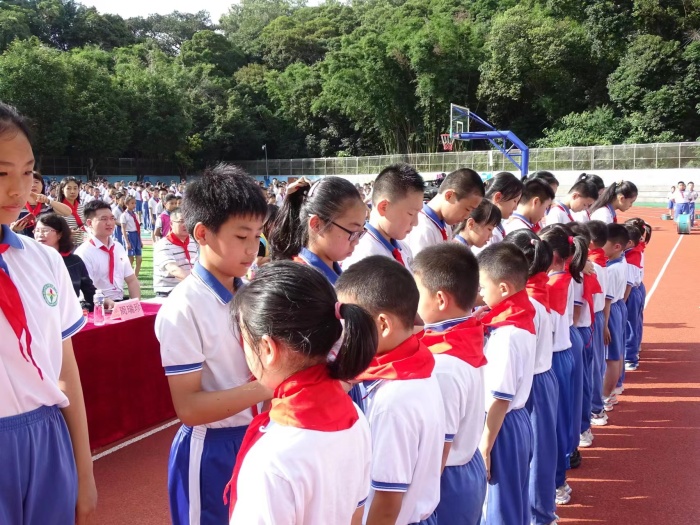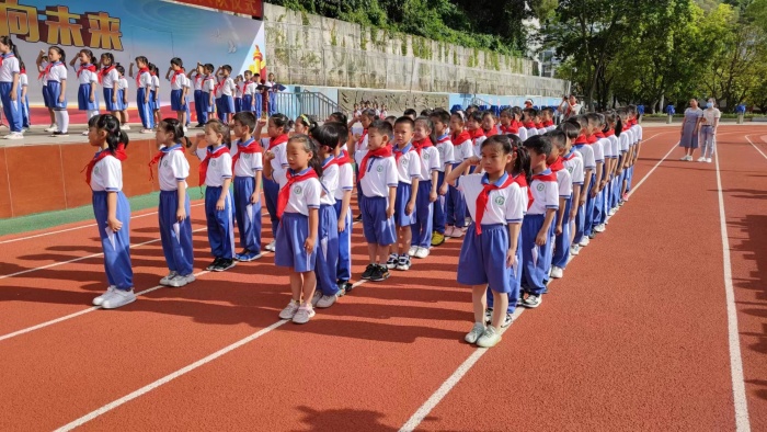 上午8:30,全體隊(duì)員齊唱《中國少年先鋒隊(duì)隊(duì)歌》。在嘹亮的歌聲中,一年級新隊(duì)員入隊(duì)儀式拉開序幕。少先隊(duì)大隊(duì)輔導(dǎo)員陳一蕾老師宣讀新隊(duì)員名單,六年級的少先隊(duì)代表為一年級同學(xué)佩戴紅領(lǐng)巾,與新隊(duì)員互敬隊(duì)禮。隨后,新隊(duì)員在陳老師的帶領(lǐng)下,完成了莊嚴(yán)宣誓。張家邊社區(qū)團(tuán)委書記陳俊杰先生發(fā)表了慷慨激昂的講話,陳書記表達(dá)了對全體隊(duì)員的祝福并提出了殷切的希望。一(3)中隊(duì)的喬欣妍作為新隊(duì)員代表進(jìn)行了發(fā)言,表達(dá)了爭做好隊(duì)員的決心,并表示與全體隊(duì)員一起用實(shí)際行動為隊(duì)旗添光彩。最后,入隊(duì)儀式在新隊(duì)員們響亮的呼號聲中落下帷幕。