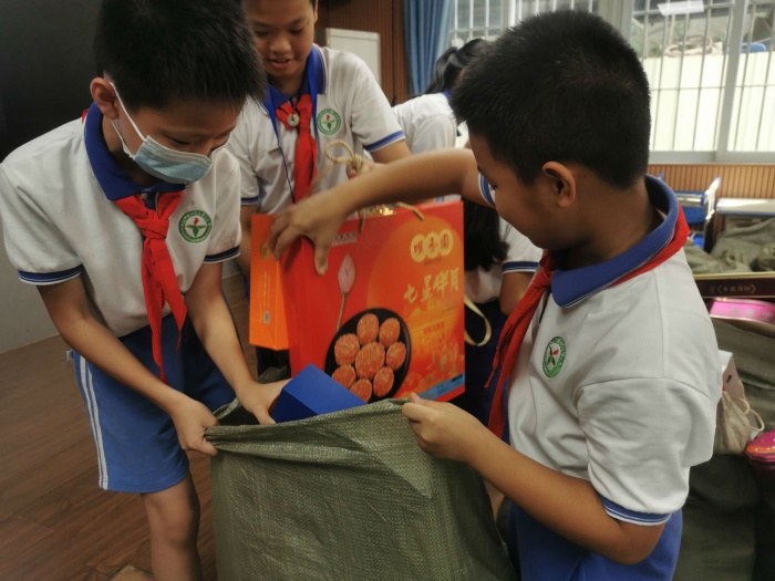 活動結(jié)束后,在少先隊(duì)大隊(duì)輔導(dǎo)員陳一蕾老師的組織下,少先隊(duì)隊(duì)干們把收集到的月餅盒、廢舊電池、電子廢品整理分裝包扎好,等待回收人員的回收。