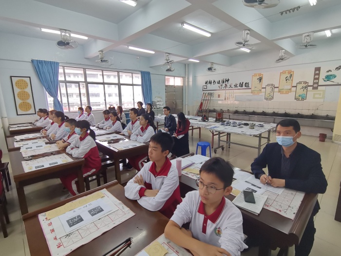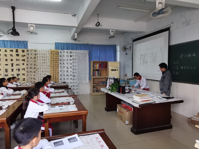 第一階段,首先由課題組成員李堆威老師進行書法課例展示——《奇正相成》,李老師由生活中的平衡圖片導入課題,再引導學生觀察“深”字的結(jié)構(gòu),相機總結(jié)軟筆書寫時要注意運筆方向、比劃位置以及部首之間穿插避讓的觀察方法。通過書法教育潛移默化地促進學生優(yōu)秀的品性,滲透書法教育培育學生優(yōu)秀品行的實施策略。