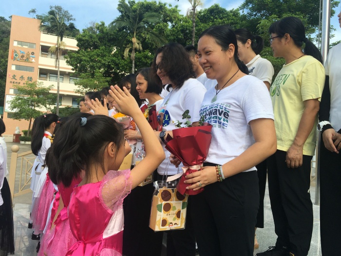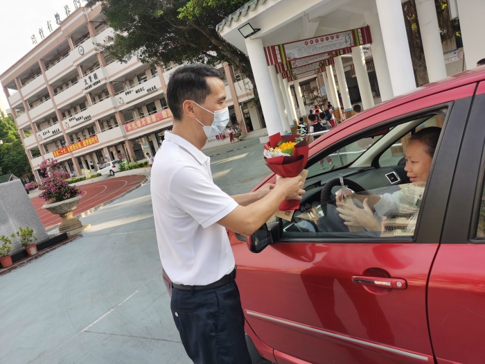 9月9日早上,校園里到處洋溢著溫暖的節(jié)日氛圍。每間教室的展板上都張貼著精美的手工作品。紙短情長,每一張作品都在訴說孩子們對老師的感恩之情。當老師們踏進校園時,蔡長青校長帶領著少先隊員們有序地向辛勤工作的老師們送上鮮花:“老師,您辛苦了,節(jié)日快樂!”孩子們滿懷熱忱地向老師們表達自己的感激之情。此時,鮮花的美好溫暖著每一位老師的心靈,笑容在老師的臉上綻放,幸福在老師的心中流淌。在這個特殊的日子里,每位老師都感受到作為一名人民教師的幸福感。