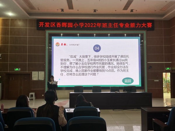 第二環(huán)節(jié)情景答辯,由不參賽的班主任根據(jù)熱點(diǎn)話(huà)題或班級(jí)管理中遇到的情境出題,題目貼近班主任工作實(shí)際,引起了參賽選手和在場(chǎng)教師的深思。答辯現(xiàn)場(chǎng)掌聲不斷,選手們對(duì)案例進(jìn)行了科學(xué)分析、精準(zhǔn)判斷,不僅對(duì)問(wèn)題的起因進(jìn)行了分析,同時(shí)給出了解決問(wèn)題的思路、對(duì)策。