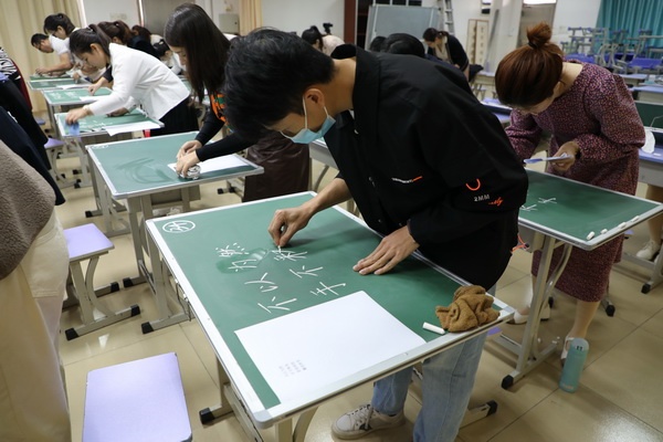 12月17日早上,開發(fā)區(qū)教育事務(wù)指導(dǎo)中心張立超老師帶來密封的試題,現(xiàn)場請(qǐng)參賽選手抽取拆封。接著馬上進(jìn)行大賽的第一項(xiàng)——粉筆字書寫,要求選手在5分鐘內(nèi)用粉筆字書寫四組詞語。只見選手們凝神屏氣、手腕旋動(dòng),筆下的字跡或娟秀端正,或遒勁有力,充分展示了語文教師扎實(shí)的書寫功底,領(lǐng)略了中華民族的漢字之美,引得觀摩老師紛紛拍照學(xué)習(xí)。