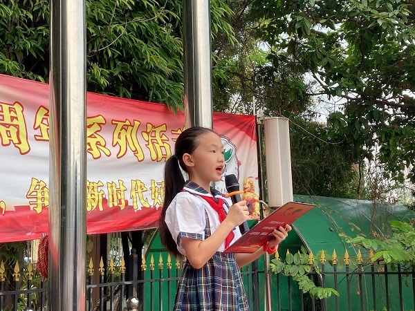 李品諾同學(xué)通過(guò)主題演講帶領(lǐng)同學(xué)們回顧了7月1日在慶祝中國(guó)共產(chǎn)黨成立100周年的大會(huì)上,敬愛(ài)的習(xí)近平爺爺莊嚴(yán)地向全世界宣告我們實(shí)現(xiàn)了第一個(gè)百年奮斗目標(biāo)時(shí)振奮人心的時(shí)刻,帶領(lǐng)同學(xué)們回顧了中國(guó)體育健兒在東京奧運(yùn)會(huì)上頑強(qiáng)拼搏、不懈奮斗、突破極限,打破紀(jì)錄、爭(zhēng)金奪銀、為國(guó)爭(zhēng)光的時(shí)刻。李品諾同學(xué)還向同學(xué)們介紹了在新冠疫情肆虐全球的形勢(shì)下,中國(guó)快速、有效地控制疫情,堅(jiān)持人民至上,帶領(lǐng)全民抗疫,復(fù)工復(fù)產(chǎn)成為全球典范。幾天前,3名航天員在我們自己建設(shè)的空間站里度過(guò)了近3個(gè)月的時(shí)間順利返航。在9月25日晚上,被美國(guó)控制在加拿大的孟晚舟女士也回到了我們偉大祖國(guó)的懷抱。最后,李品諾同學(xué)滿懷激動(dòng)地說(shuō):“作為新時(shí)代的青少年,我們必將努力學(xué)習(xí),為國(guó)出力,請(qǐng)祖國(guó)人民放心!”