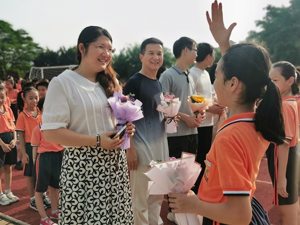 9月10日清晨,開發(fā)區(qū)中心小學(xué)在升旗臺前舉行感懷師恩的活動。莊嚴肅穆的升旗儀式之后,少先隊員代表配樂朗誦《感恩的心》,深情獻唱,致敬園丁。在《每當我走過老師窗前》優(yōu)美抒情的旋律中,一個個佩戴著紅領(lǐng)巾的少先隊員們,有序地向全體教師獻花,致以老師真誠的節(jié)日祝福。陽光下,閃耀著的不僅是高高飄揚的紅旗,更有老師和學(xué)生那一張張喜悅的笑臉。
