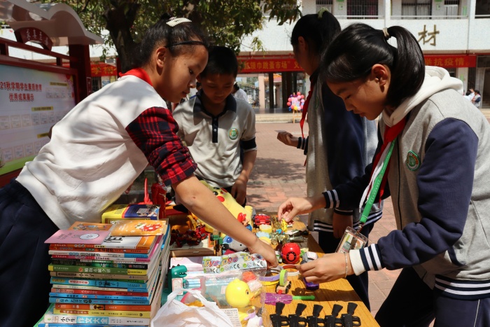 活動(dòng)前,各中隊(duì)提前將各班別具一格的宣傳海報(bào)、琳瑯滿目的商品---學(xué)習(xí)用品、毛絨玩具以及家長(zhǎng)愛(ài)心捐贈(zèng)的新衣服和新電風(fēng)扇等。還對(duì)自己班的“店鋪”合理的配備了保管員、售貨員、促銷員等相關(guān)“工作人員”。