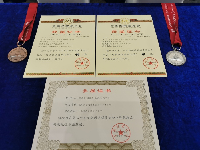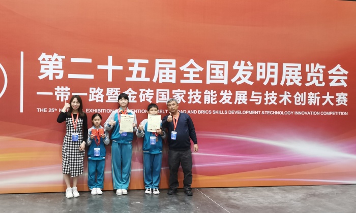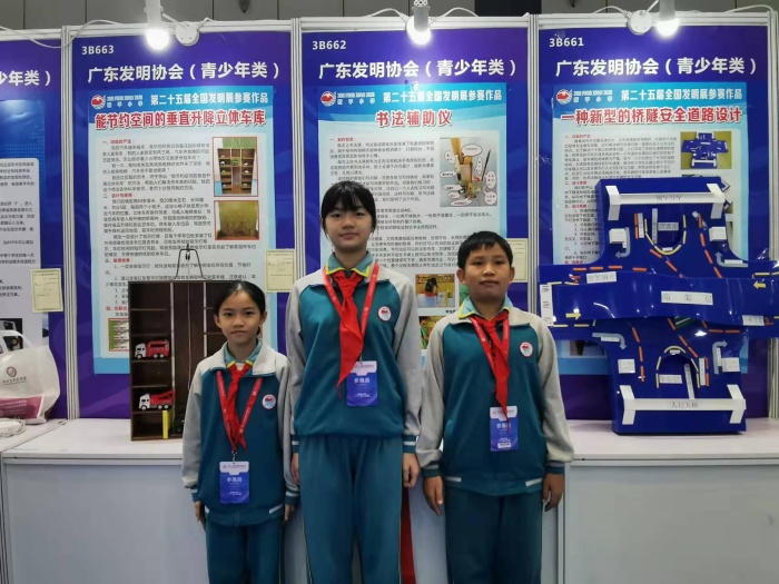 經(jīng)過(guò)3天時(shí)間的激烈競(jìng)爭(zhēng),新平小學(xué)最終摘取了全國(guó)銀獎(jiǎng)1項(xiàng)、銅獎(jiǎng)1項(xiàng)的好成績(jī)。馮潤(rùn)根、馮瑩和陳杰強(qiáng)三位老師輔導(dǎo)劉翠娟、陳慧韻、周君昊、許嗣通同學(xué)發(fā)明的《書法輔助儀》榮獲銀獎(jiǎng)。輔導(dǎo)周君昊、陳慧韻、許嗣通、吳樂(lè)兒同學(xué)發(fā)明的《一種新型的橋隧安全道路設(shè)計(jì)》榮獲銅獎(jiǎng)。