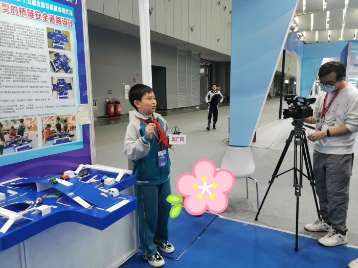 在展評(píng)中,同學(xué)們熱情大方地向評(píng)委介紹作品的特征、用途、創(chuàng)新點(diǎn),受到評(píng)委的好評(píng),還接受了媒體的采訪。