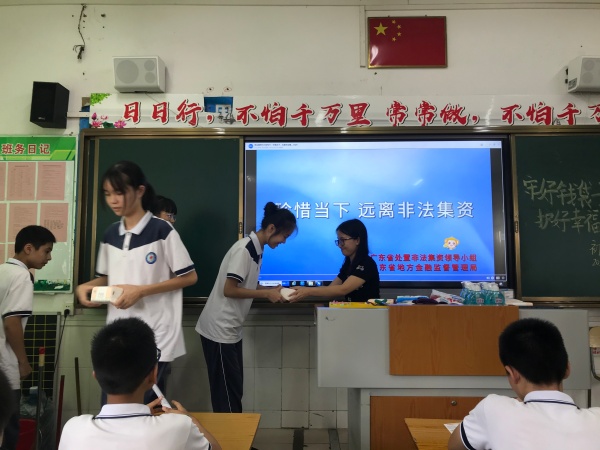 各年級(jí)響應(yīng)號(hào)召,積極開展了以“拒絕高利誘惑、遠(yuǎn)離非法集資”主題班會(huì),各班以播放由廣東省處置非法集資領(lǐng)導(dǎo)小組、廣東省地方金融監(jiān)督管理局錄制的宣傳教育視頻——“珍惜當(dāng)下 遠(yuǎn)離非法集資”開場(chǎng),旨在通過生動(dòng)形象的案例畫面讓學(xué)生初步建立對(duì)“非法集資”的認(rèn)識(shí)。同學(xué)們通過閱讀非法集資的宣傳單張,進(jìn)一步了解了如何辨別非法集資,如何避開非法集資陷阱等知識(shí),同學(xué)們紛紛表示要堅(jiān)決抵制高額回報(bào)的誘惑,不貪小便宜,切實(shí)做到不接受各類非法集資的傳單,不散布非法集資的信息。同時(shí),為了檢驗(yàn)此次活動(dòng)的宣傳效果,各班還開展了“非法集資”有獎(jiǎng)問答、“非法集資”即興演講等活動(dòng),充分調(diào)動(dòng)學(xué)生參與積極性。