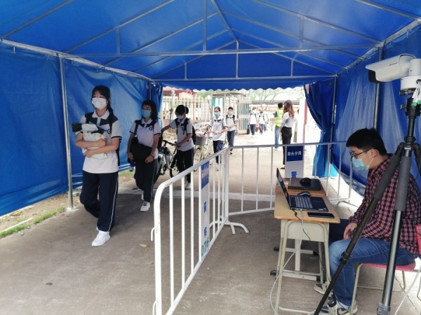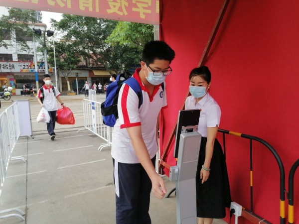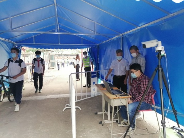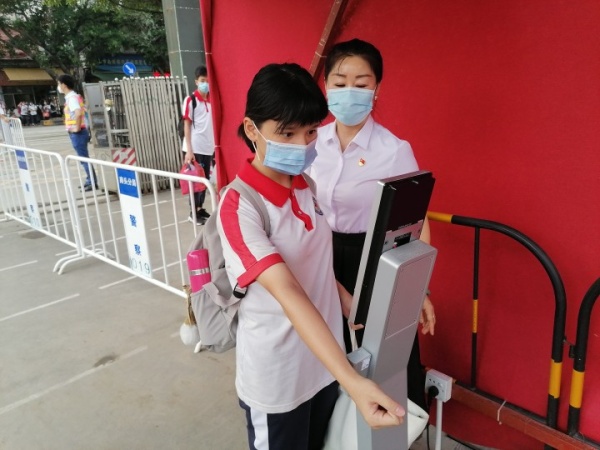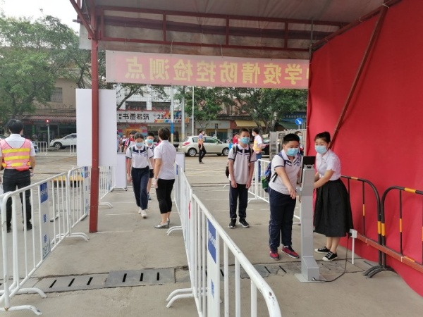 中山市教育和體育局檢查組蒞臨南頭鎮(zhèn)初級中學(xué)檢查開學(xué)工作。在學(xué)校南門,同學(xué)們有序地相隔一米,自覺接受體溫檢測,檢測通過后,按照要求停放自行車,回教室安坐。在北門,科技助力學(xué)生返校,南頭鎮(zhèn)初級中學(xué)在校門口設(shè)置了人體熱感測溫系統(tǒng),可實現(xiàn)立馬測溫讓學(xué)生快速通過,避免扎堆。