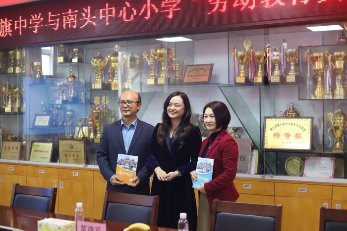 講座結(jié)束后陳亞玲校長贈送給南頭鎮(zhèn)中心小學(xué)勞動教育校本教材讀本、紅旗中學(xué)建校35周年紀(jì)念品,郭建平、吳婉韻兩位副校長代表接收,活動圓滿結(jié)束。