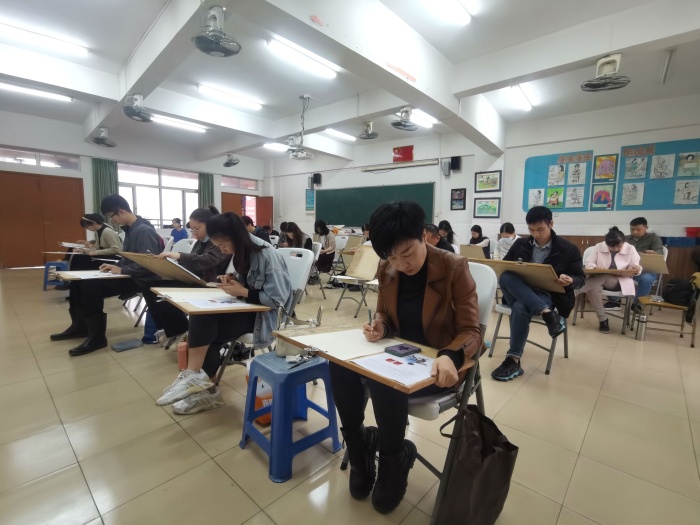 速寫是美術教師教學基本功預賽的最后三項內(nèi)容。要求在短時間內(nèi)快速表現(xiàn)正確的人物比例關系和動態(tài)特征,體現(xiàn)美術教師平時課堂示范的重要基本功之一。老師們拿到選題后,紛紛拿起畫筆,屏氣凝神,仔細觀察人物動態(tài),努力經(jīng)營畫面,從流暢熟練的線條捕捉,再到線條穿插關系的處理,運用自己熟練的作畫工具,多元化、多層次地表現(xiàn)出人物的形體特征和比例結構及場景設計。