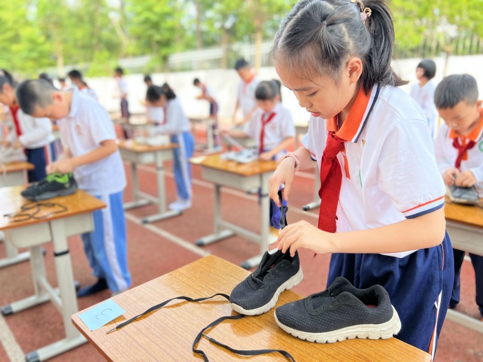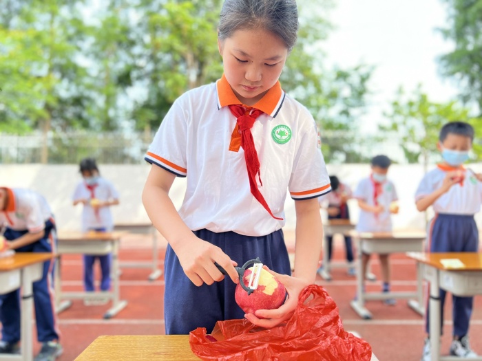 系鞋帶是孩子們每天都要做的事。比賽過(guò)程中,同學(xué)們熟練地穿起了鞋帶,接著,同學(xué)們抓起鞋帶兩端,交叉、打結(jié)、綁緊,動(dòng)作迅速又靈活。在一雙雙巧手的牽引下,細(xì)長(zhǎng)的鞋帶化為了一只只美麗的蝴蝶結(jié)。四年級(jí)的同學(xué)們低著頭認(rèn)真地削著蘋(píng)果,他們一邊握著水果刨,一邊轉(zhuǎn)動(dòng)著手中的蘋(píng)果,薄薄的蘋(píng)果皮一圈圈地掉下。削完后,每個(gè)同學(xué)都展示著削得干干凈凈的蘋(píng)果,咬一口,分外香甜。