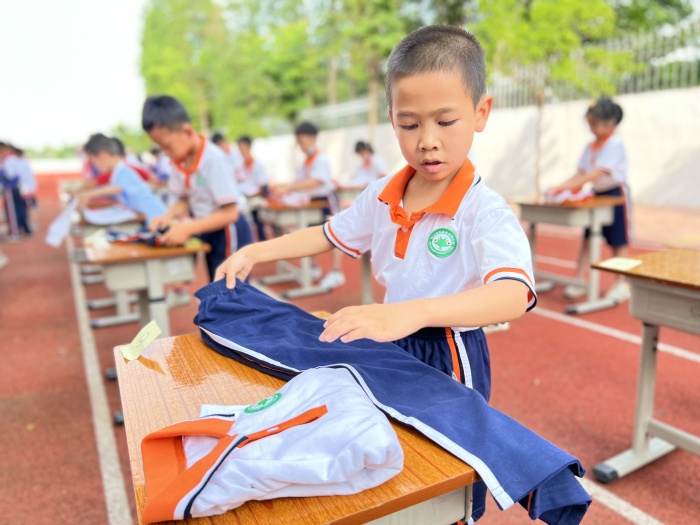 一年級(jí)進(jìn)行的是疊衣服比賽,同學(xué)們雖然年紀(jì)小,但是疊起衣服來(lái)可是有模有樣。孩子們?nèi)σ愿埃焖?、整齊、高質(zhì)量地完成比賽任務(wù),爭(zhēng)先恐后地舉起自己的小手示意已經(jīng)完成比賽。二年級(jí)進(jìn)行的是穿衣服、佩戴紅領(lǐng)巾比賽。同學(xué)們動(dòng)作迅速,手法嫻熟,衣服和紅領(lǐng)巾穿戴得又快又美觀!