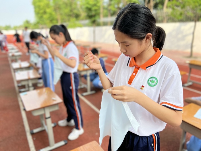 比賽一聲令下,五年級(jí)的同學(xué)們擼起袖子,彎下腰,忙碌起來(lái)……他們先將衣服浸濕,在衣領(lǐng)、袖口等特別臟的部分涂上洗衣粉,用力搓洗。揉搓,擰干,用清水漂洗……同學(xué)們訓(xùn)練有素,動(dòng)作嫻熟,洗刷漂曬,一氣呵成。六年級(jí)的同學(xué)們小心翼翼地穿針引線,全神貫注地縫制著。銀針穿梭,彩線翻飛,小手輕巧地將一顆顆紐扣牢牢釘在布片上。
