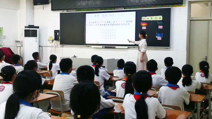 本次新教師匯報(bào)課,李老師呈現(xiàn)的是五年級的閱讀教學(xué)課例:《四季之美》。在課堂中,李老師抓住了“美”這一條主線,讓學(xué)生在充分朗讀感悟后,體會作者筆下的語言文字美、韻味美、選材美。接著引導(dǎo)學(xué)生通過觀察圖片、感情朗讀、延伸聯(lián)想等策略展開豐富的想象,體會作者所要表達(dá)的四季之美。