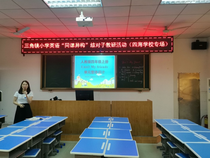 活動開始是由沙欄小學鐘曉亮老師與四海學校郭煥娣老師進行“同課異構”課堂展示。兩位老師展示的是人教版四年級上冊Unit3 My friends的第一課時。鐘老師以一首歡快的歌謠引入,把同學們帶入了輕松愉快的課堂。在授課過程融入游戲、角色扮演等教學活動,激起學生的學習興趣。鐘老師自然的教態(tài)、活潑的手勢、多樣的評價方法引導學生不斷學習。四海學校的郭老師結合教材的重難點以及學科的特點,利用愉快的教學方法,在愉快輕松的氣氛中進行教學,從視、聽、說、寫等方面使學生得到語言的訓練,提高學生英語學習的興趣。在本次活動中,兩位老師憑借扎實過硬的教學素質,流利的口語,以及親切的態(tài)度,為大家展示了兩節(jié)精彩的教研課。