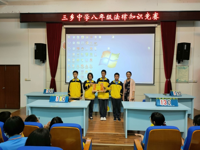 在此次法律知識賽活動中,學(xué)校精心組織,廣泛發(fā)動。由八年級各班先在班級內(nèi)部選拔出四名代表參賽,競賽賽程分為必答題和搶答題兩部分。必答題環(huán)節(jié)由每班代表抽題,依次作答,因各班參賽同學(xué)對相關(guān)法律知識了解較為深入,所以在必答題環(huán)節(jié)各班分數(shù)相差不大。到了搶答題環(huán)節(jié),各班代表爭相舉手發(fā)言,場景激烈而有序,最終八年級(8)班參賽隊員憑借扎實的法律知識儲備,獲得本屆法律知識競賽特等獎,由楊主任頒獎并表示祝賀,宣布由八(8)班代表學(xué)校參加市片區(qū)比賽!