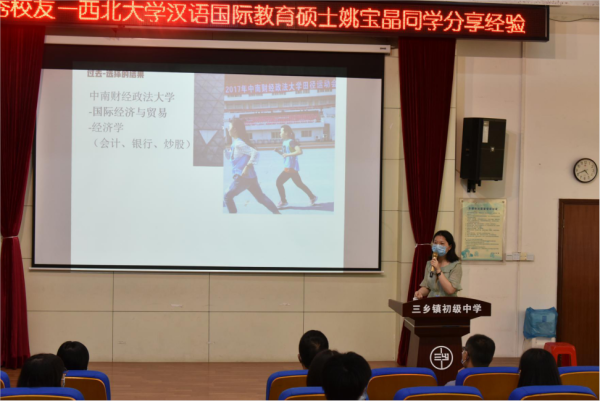 姚寶晶同學(xué)在2011年以優(yōu)異成績(jī)考入中山市第一中學(xué),高考考入了中南財(cái)經(jīng)政法大學(xué),連續(xù)三年獲得“人民獎(jiǎng)學(xué)金”。2018年考入西北大學(xué)漢語國(guó)際教育碩士研究生,2019年通過國(guó)家漢辦考核成為一名漢語教師志愿者,赴菲律賓布拉卡大學(xué)孔子學(xué)院執(zhí)教一年。此次回到母校,她給師弟師妹們帶來了以“過去——選擇的結(jié)果”為主題的經(jīng)驗(yàn)交流活動(dòng)。通過講故事、談經(jīng)驗(yàn)的方式,為即將走上人生選擇點(diǎn)的2020屆初三畢業(yè)生答疑解惑,促使大家更快更好地開啟學(xué)習(xí)新起點(diǎn)。