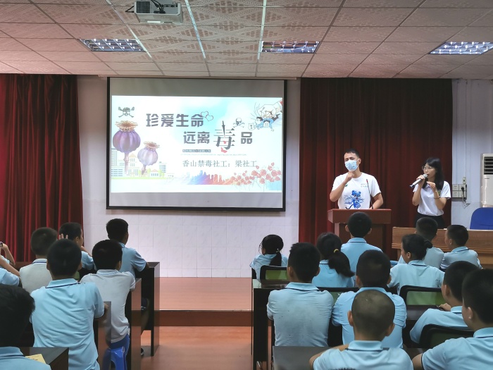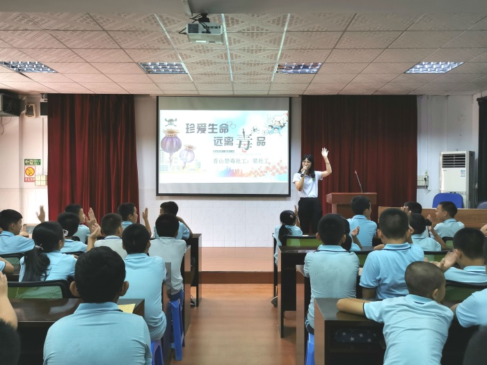 活動中,沙溪禁毒辦社工們針對青少年好奇心強,辨別能力、自制力較差,容易受犯罪分子的誘惑利用這一特點,以刑事責(zé)任年齡和毒品的嚴(yán)重危害后果為切入點,用干練利落的言談舉止,幽默風(fēng)趣的表達(dá)風(fēng)格,獨特活潑的授課方式,系統(tǒng)地引導(dǎo)學(xué)生學(xué)習(xí)什么是毒品、什么是吸毒、毒品的危害、毒品預(yù)防類、以及拒毒技巧等知識。警醒同學(xué)們要珍惜自己美好的青春年華,選擇健康的娛樂活動和生活方式。同時,在禁毒工作人員梁社工的引導(dǎo)下,六年級學(xué)生一起觀看了禁毒動畫短片《阿威 禁毒俠出場》,并且邀請了動畫片的主人公阿威來給學(xué)生講述自己戒毒的過程和毒品給自己、家庭帶來的傷害。