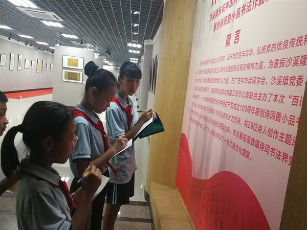 本次展覽旨在慶祝中國共產(chǎn)黨成立100周年,展示黨的百年風(fēng)華,弘揚(yáng)黨的優(yōu)良傳統(tǒng)和作風(fēng),凝聚起開啟全面建設(shè)社會主義現(xiàn)代化國家新征程的精神力量,重振沙溪龍威和中山虎威,加快高質(zhì)量崛起貢獻(xiàn)文化力量。本次展覽共有29位詩人創(chuàng)作主題詩詞作品,44位書法家以書法的形式展現(xiàn)紅色記憶。樂群小學(xué)少先隊(duì)代表一邊欣賞作品,一邊分享自己的感受心得,同時(shí)不忘認(rèn)真做筆記。