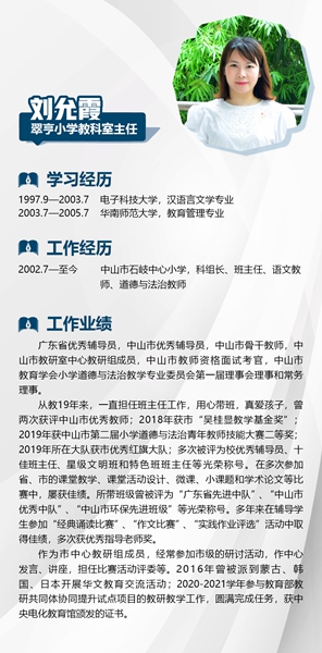 懷著敬仰,本著“承偉人志,揚(yáng)理想帆”的辦學(xué)理念,中山市直屬學(xué)?!猩绞惺行男W(xué)教育集團(tuán)全力托舉翠亨小學(xué),用心用情做好集團(tuán)化辦學(xué)工作,第一年派駐了一支8名的骨干團(tuán)隊(duì)。其中,1位校長,3位行政人員是長期派駐的,4位教師是按照市教體局相關(guān)文件精神輪崗的骨干教師。讓我們一起看看他們“閃光”的履歷:
