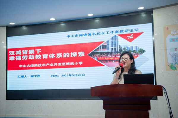 隨后,全體成員來到階梯室開展論壇研討活動,由中山市名校長工作室主持人周錦連校長主持。周校長簡單地介紹了《中共中央國務(wù)院關(guān)于全面加強(qiáng)新時代大中小學(xué)勞動教育的意見》《義務(wù)教育勞動課程標(biāo)準(zhǔn)(2022年版)》等文件,指出當(dāng)今勞動教育的重要意義,并呼吁工作室成員們相互交流、學(xué)習(xí)和借鑒優(yōu)秀經(jīng)驗(yàn),共同促進(jìn)學(xué)校勞動教育的發(fā)展。隨后,工作室的四位校長分別作了專題報告。