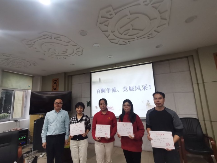 接下來會議進(jìn)入第二個議程——“向上杯”(銳氣組)課堂教學(xué)比賽總結(jié)表彰會。首先是英語、數(shù)學(xué)、語文科組的教師代表分別就本科組參加本次課堂教學(xué)比賽的情況進(jìn)行總結(jié),三位教師都重點(diǎn)指出集體的力量,賽前的集體備課、磨課與聽課研討,均為參賽教師提供了許多助益,每一節(jié)賽課都集中了本科組所有教師的智慧,是大家共同努力的結(jié)果。之后丘主任宣讀獲獎名單,本次比賽共評出三個一等獎和五個二等獎,由李校長和張巍副校長為獲獎教師及科組頒獎。每位教師都懷著激動的心情接過沉甸甸的獎杯,這是他們努力耕耘的收獲,是每一滴辛勤汗水的證明。