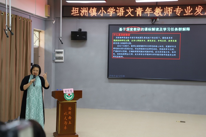 接著由梁雪菊老師開展以《基于深度教研的課標解讀及學習任務群解釋》為主題的講座,就“精要研讀新課標,提綱攜領,把握課程要旨?!焙汀盎緦W習任務群教學評實案,解構(gòu)教與學?!眱蓚€要點,為老師們做出專業(yè)指導,老師們認真聽講,詳細記錄。她利用身邊的事例,深入淺出地為青年教師指點迷津,同時也肯定了李老師的專業(yè)素養(yǎng),指出本節(jié)課需要改進之處。