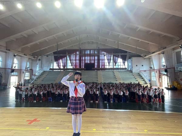 本次入隊(duì)儀式由學(xué)校大隊(duì)委楊可瀅和邵越兩位優(yōu)秀少先隊(duì)員主持。隨著嘹亮的出隊(duì)旗曲響起,旗手和護(hù)旗手們邁著整齊、鏗鏘有力的步伐出場(chǎng)。新老隊(duì)員們精神飽滿,歌聲洪亮,唱出了心中的自豪和對(duì)少先隊(duì)組織的無(wú)比熱愛(ài)。