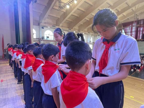 學(xué)校大隊(duì)輔導(dǎo)員常偉麗老師宣讀了二年級(jí)分批入隊(duì)的新隊(duì)員名單,并由五(3)中隊(duì)的優(yōu)秀少先隊(duì)員代表為新隊(duì)員戴上了鮮艷的紅領(lǐng)巾。戴上紅領(lǐng)巾的新隊(duì)員們個(gè)個(gè)精神抖擻,臉上洋溢著幸福和自豪的笑容。